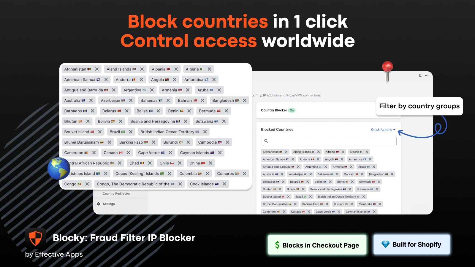 Blocky bloque les visiteurs par e-mail/téléphone/IP/pays/VPN pour stopper les robots et les fraudes, ainsi que des analyses des visiteurs et des redirections géographiques.