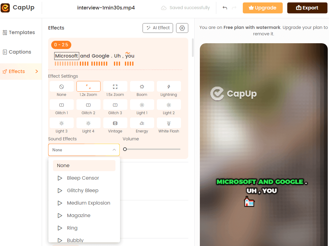 Zoom automatique pour les hautes lumières : CapUp ajoute automatiquement des effets de zoom à vos vidéos pour mettre en évidence les points clés et fidéliser les spectateurs.