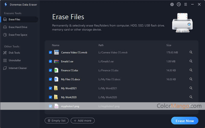 Before selling or giving away your PC to others, don't forget to erase all the sensitive data. Donemax Data Eraser can help completely and securely wipe files, folders, data, entire hard disk or unused disk, as well as deleting internet browsers' cookies, traces, and passwords. It ensures permanently data erase with 100% Data Destruction. All the erased data cannot be recovered by any other third-party data recovery software or service.