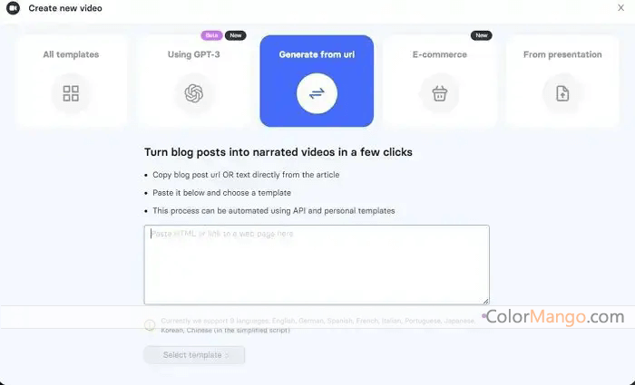 Formats d'entrée multiples : prend en charge la création de vidéos à partir de texte, de PPTX, d'URL et d'autres formats.