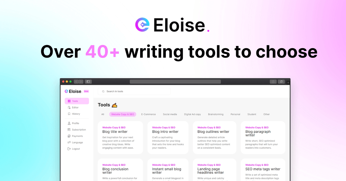 Eloise.ai est un outil de rédaction basé sur l'IA conçu pour aider les entreprises, les entrepreneurs et les créateurs de contenu à générer du contenu écrit de haute qualité rapidement et efficacement.