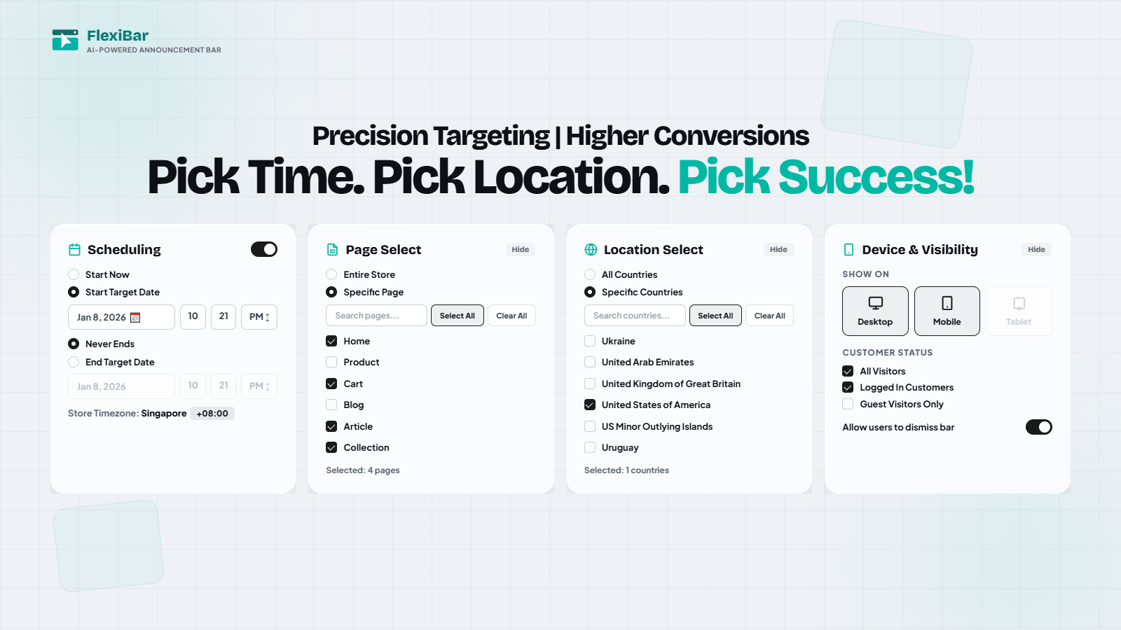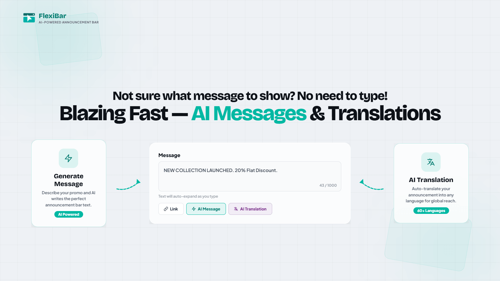 FlexiBar crée des barres d'annonce en un clic avec une traduction écrite par IA dans plus de 60 langues : marque/autocollant, compte à rebours ou curseur, ciblées par pays/page/appareil.