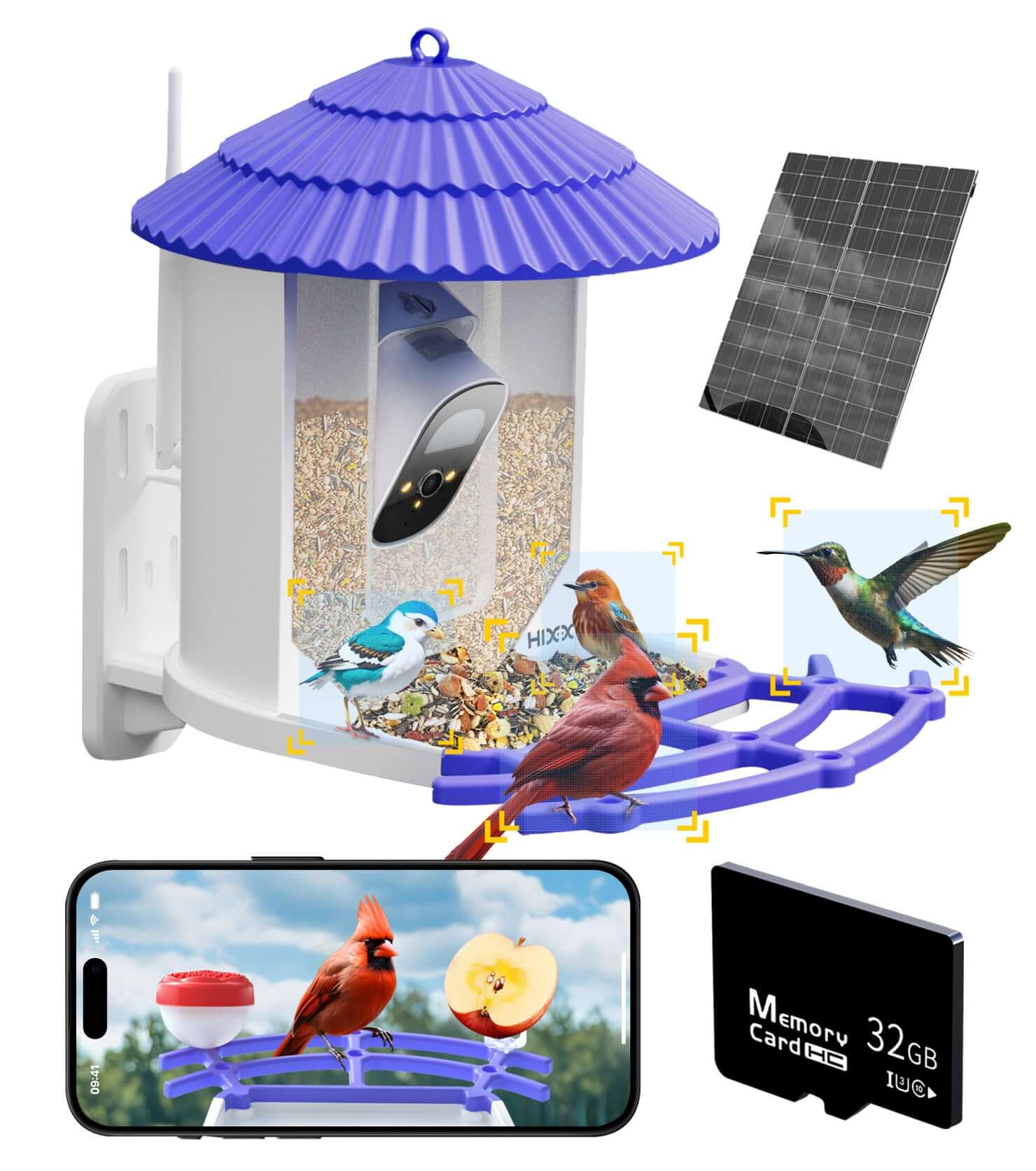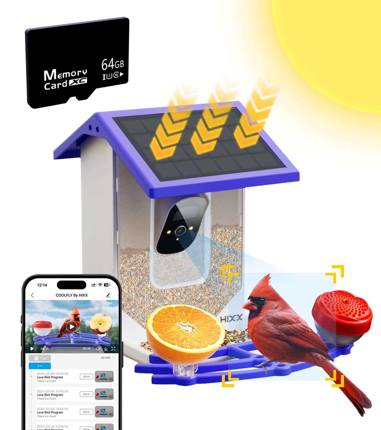 Ourcoolfly-Bird Feeder with Camera: Remote Monitoring: Allows you to observe your feathered friends from anywhere using a built-in camera. Live Streaming: Provides real-time video and audio of your bird feeder, letting you witness their feeding habits and behaviors. Two-Way Audio: Enables you to communicate with your birds remotely, adding an interactive element to their feeding experience.