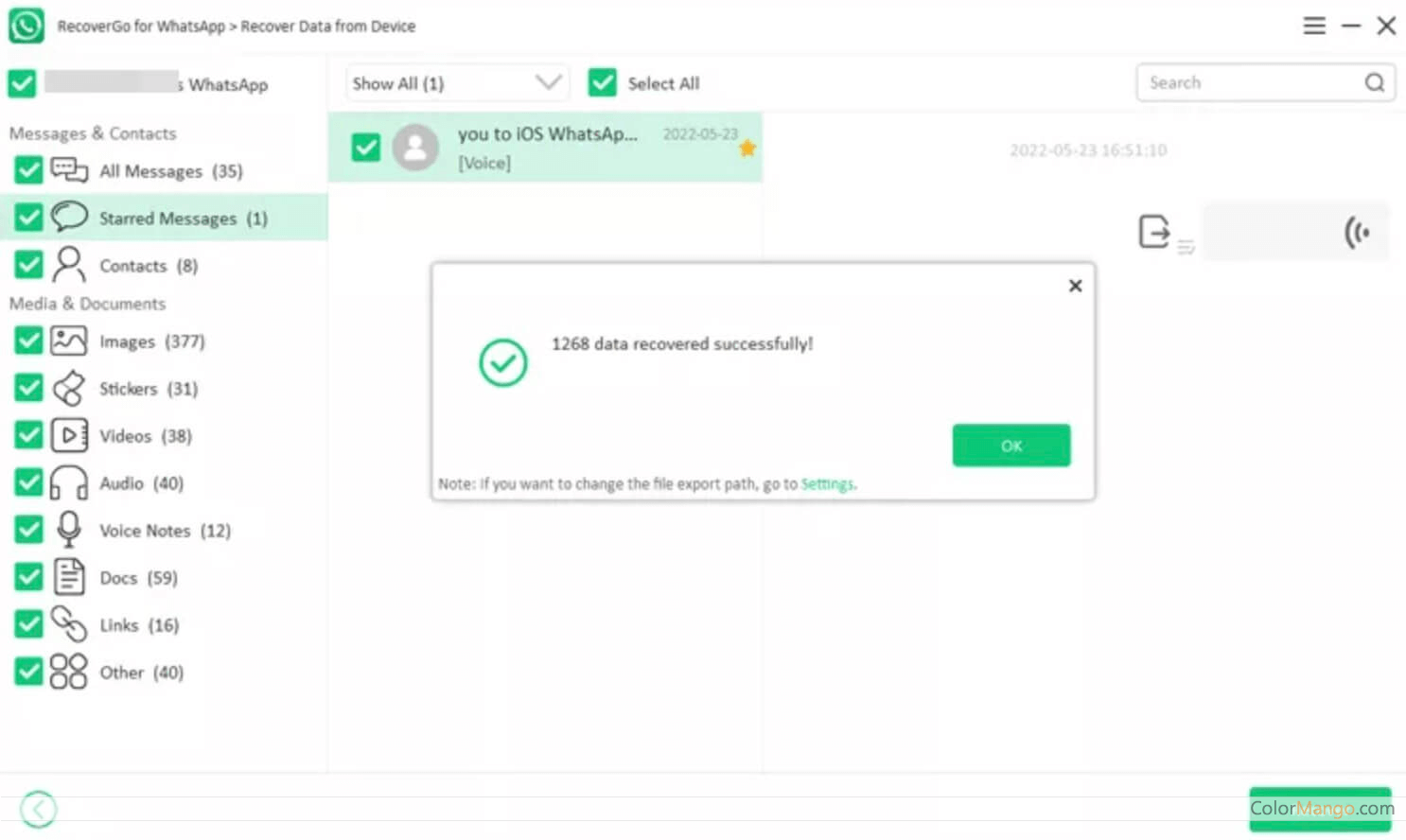 iToolab RecoverGo (WhatsApp) est capable de récupérer presque tous les types de données WhatsApp/WhatsApp Business dans toutes les situations. Supportez les chats WhatsApp, les messages favoris, les contacts, les photos, les vidéos, les fichiers audio, les statuts, les autocollants et plus encore. Vous pouvez également sauvegarder facilement les données WhatsApp/WhatsApp Business sur un PC. En outre, il permet aux utilisateurs de prévisualiser toutes les données WhatsApp supprimées avant la récupération.
