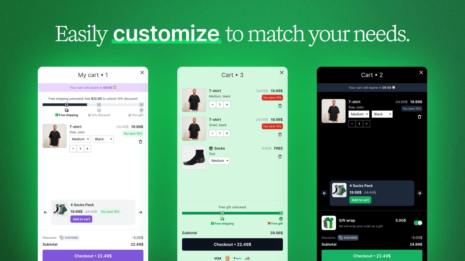 Kaching améliore l'AOV grâce à un tiroir de panier personnalisable avec compte à rebours urgent, barre de livraison gratuite et recommandations de ventes incitatives.