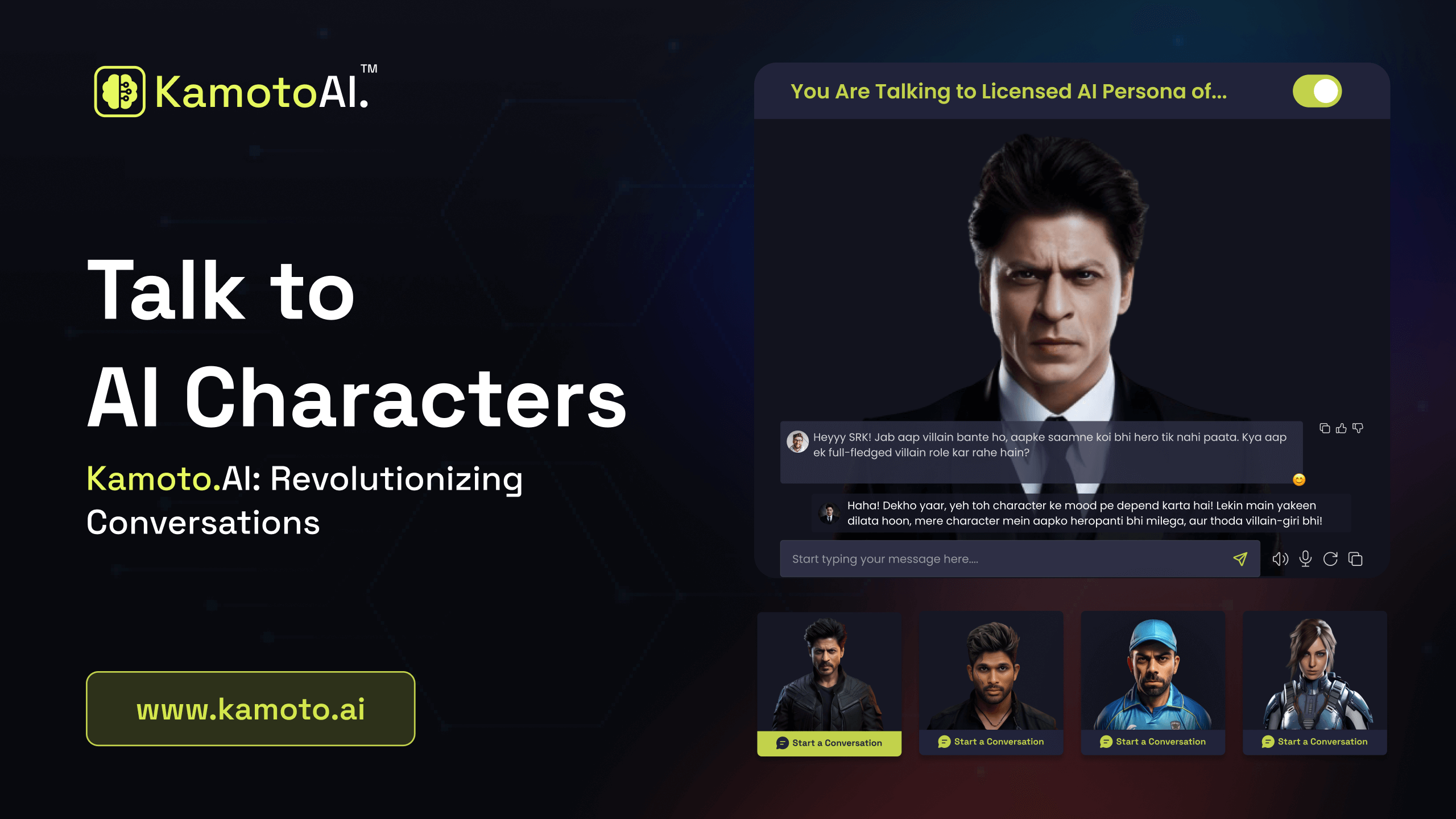 Kamoto.AI fournit des outils aux particuliers, aux entreprises, aux célébrités et aux développeurs pour concevoir des personnages virtuels uniques qui peuvent être utilisés dans un large éventail de secteurs, notamment le divertissement, l'éducation, les jeux, la santé et le service client. Kamoto.AI propose également un marché mondial de personnages et de personnalités IA, qui permet aux utilisateurs de monétiser leurs créations en les concédant sous licence ou en les louant.