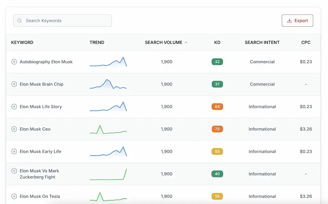 Recherche et regroupement de mots clés : découvrez les mots clés à fort impact (y compris les mots à longue traîne), analysez les tendances, le volume de recherche et la concurrence.