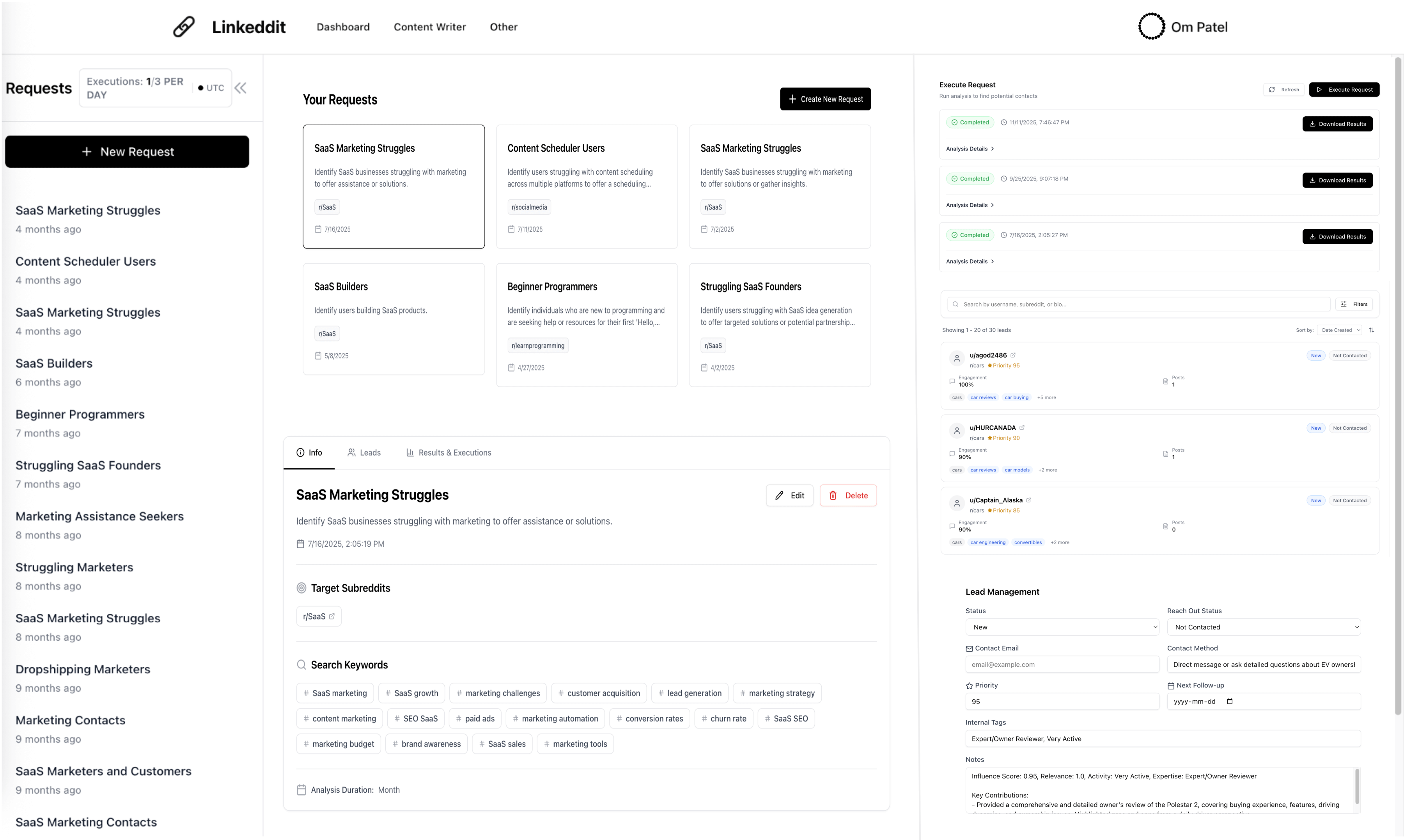 🤖 AI-Powered Prospecting Automatically identifies Reddit users with buying intent 🔗 Direct Discussion Links Jump straight into relevant conversations 📊 Engagement Metrics Understand user behavior and influence level 🧾 Export-Ready Lead Lists Download leads with context and contact suggestions 📝 AI Content Writer Turn Reddit discussions into high-performing content 📌 Subreddit Targeting Focus on the communities that matter most to your business