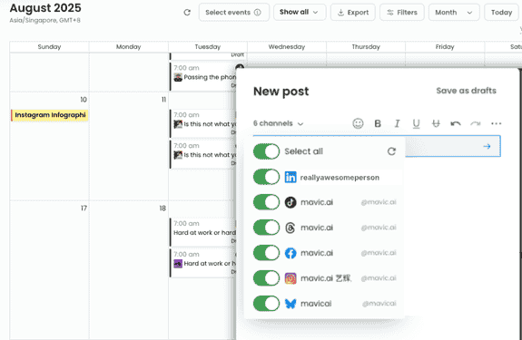 Planification et publication multicanaux : planifiez et publiez sur Instagram, TikTok, LinkedIn, X et plus encore à partir d'un seul calendrier.