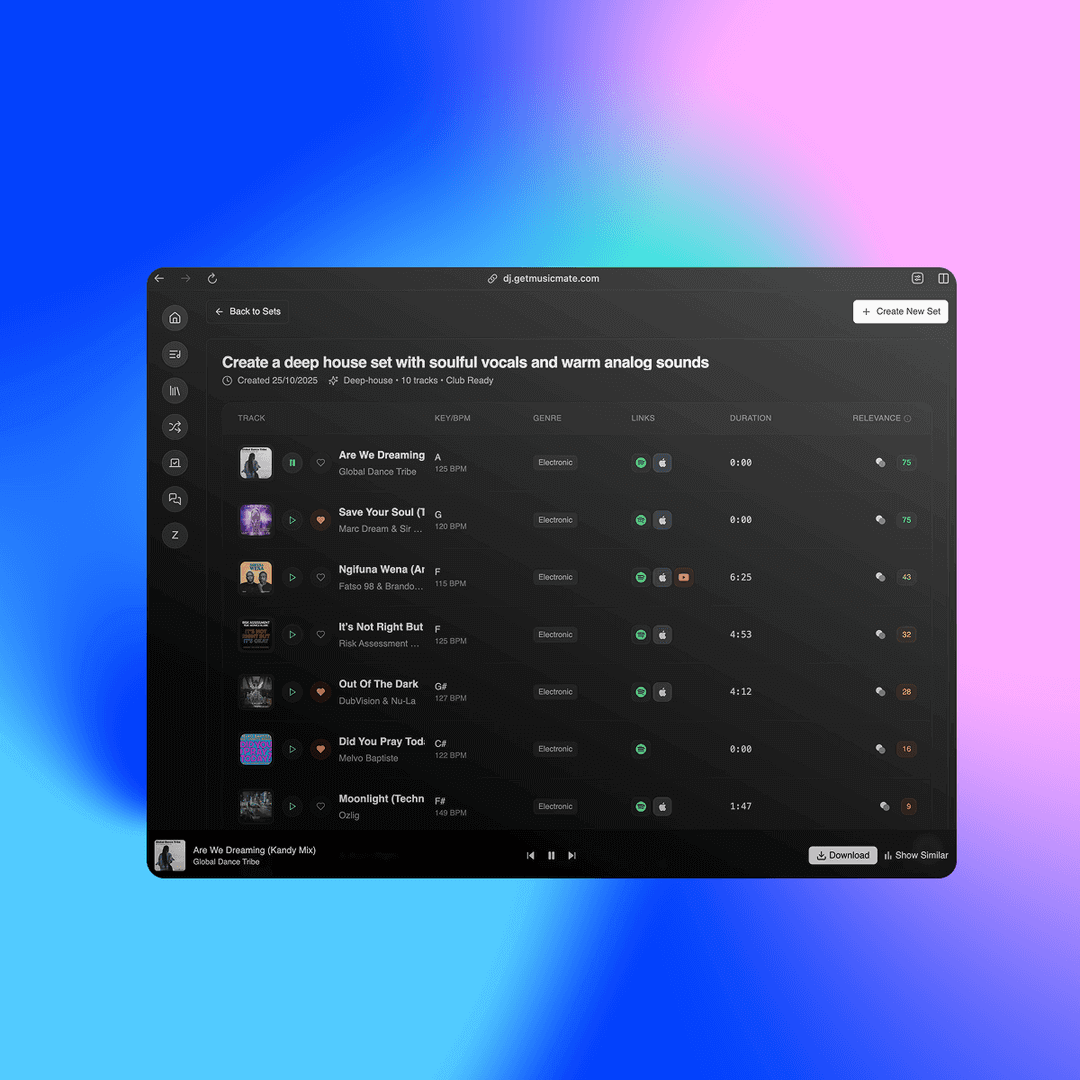 MusicMate est un outil alimenté par l'IA qui aide les DJ à découvrir des morceaux et à planifier des DJ sets en intégrant des données musicales provenant de plateformes telles que Beatport, Bandcamp et SoundCloud.