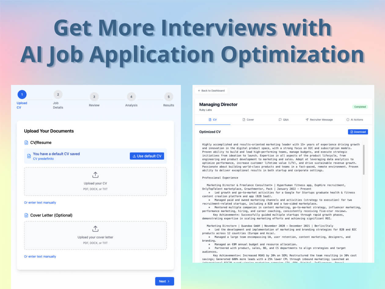 MyCVBot est un assistant basé sur l'IA qui adapte instantanément votre CV, votre lettre de motivation et les réponses à chaque description de poste, ce qui permet d'optimiser l'alignement avec les systèmes ATS et d'accélérer vos candidatures grâce à un modèle basé sur les crédits (aucun abonnement requis).