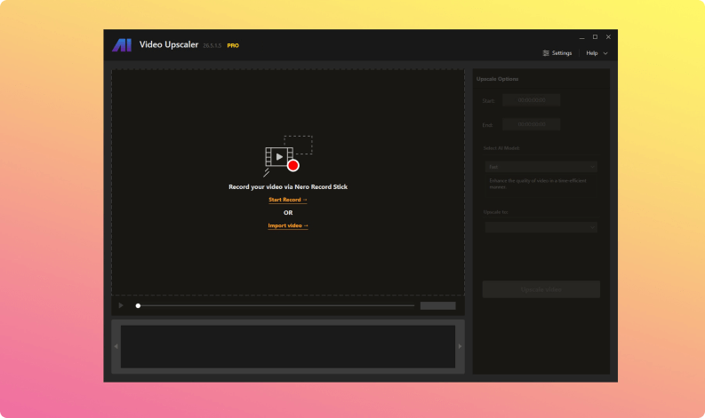 Caractéristiques : *Super résolution : améliorez les vidéos jusqu'à 2 ou 4 fois leur qualité d'origine. *Réduction du bruit : supprimez le bruit et le grain des vidéos, pour des images plus claires et plus nettes. *3 modèles d'IA : choisissez parmi trois modèles d'IA pour optimiser le processus de mise à l'échelle pour différents types de vidéos : *Rapide : idéal pour les projets urgents. *Animation : recommandée pour les animations et le contenu généré par l'IA. *Réaliste : améliorez les séquences vidéo réelles pour une qualité réaliste. *Sélection des clips : redimensionnez les clips spécifiques d'une vidéo sans qu'il soit nécessaire de les découper au préalable. *Intégration avec Nero Record Stick : enregistrez et importez des vidéos directement depuis Nero Record Stick pour une mise à l'échelle fluide.