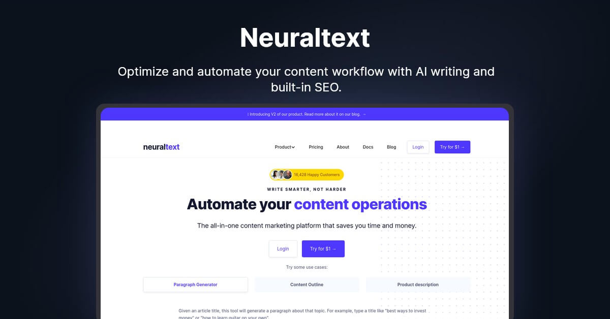 Neuraltext fournit une suite d'outils et de fonctionnalités pour aider les utilisateurs à rationaliser leur flux de travail, à produire un contenu de haute qualité adapté au référencement et à améliorer les performances des moteurs de recherche de leur site Web.
