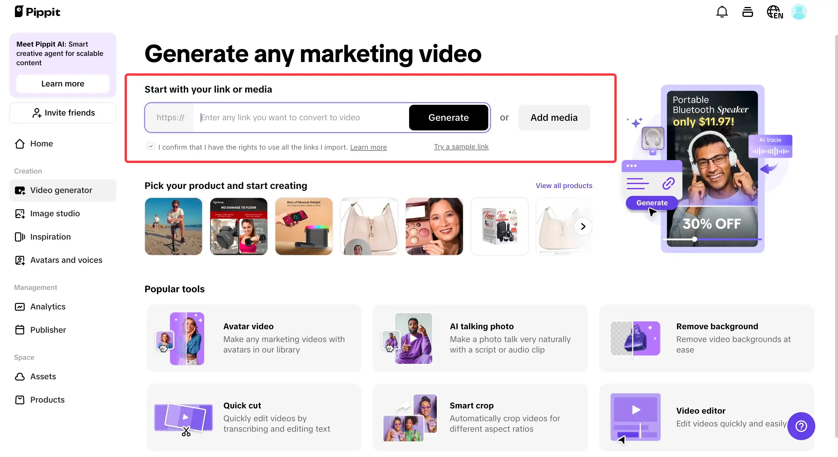 • Solution vidéo en un clic : transformez rapidement les liens ou les visuels des produits en vidéos marketing attrayantes.