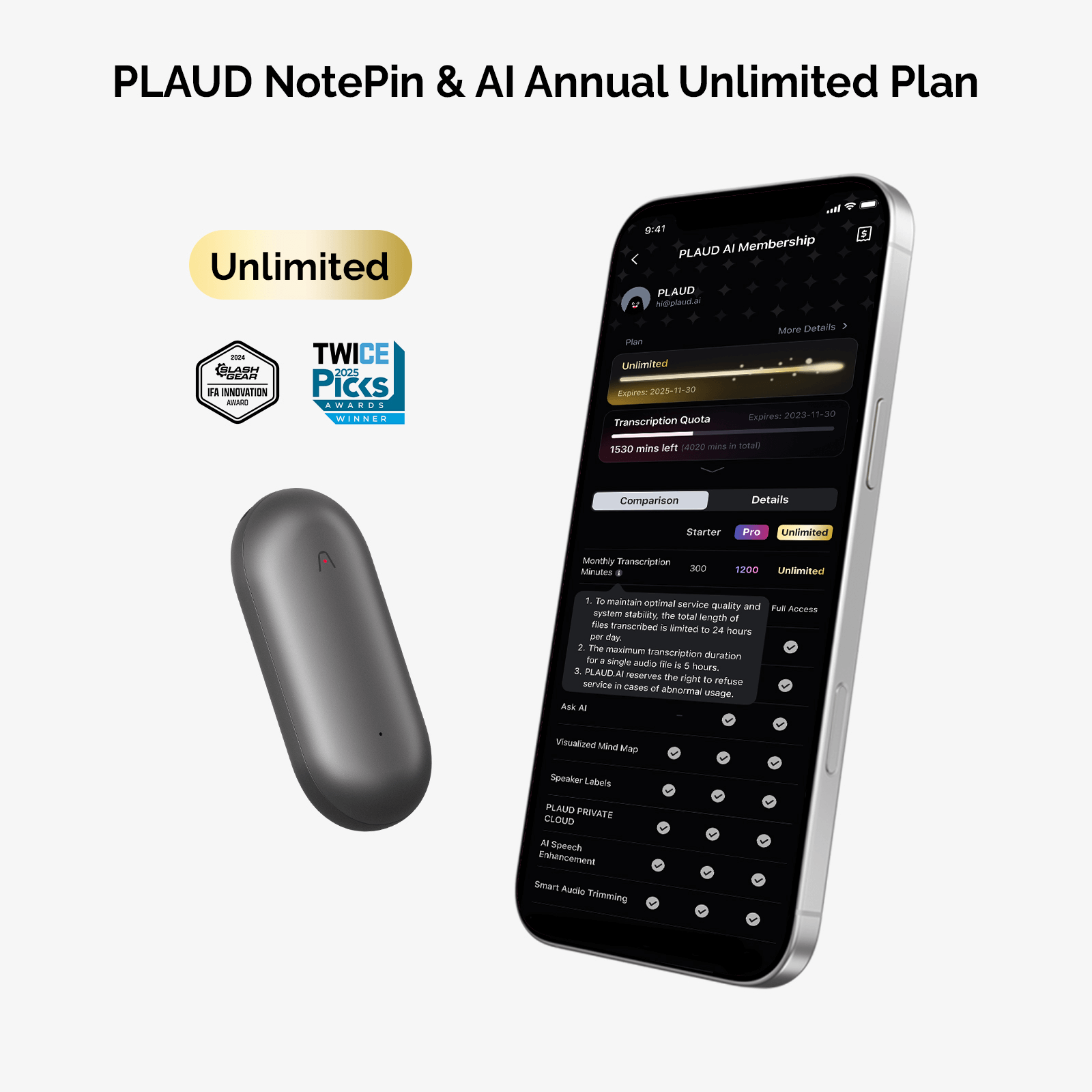 Forfait annuel illimité PLAUD NotePin & AI