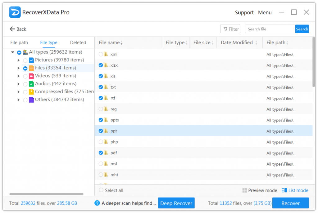 3. Easily targeting the lost data. Once scanned, you will find it easy to target the lost data by filtering file path, file type, deleted files, and you can also search with file names. And for pictures and document files, you can preview those under 30MB.