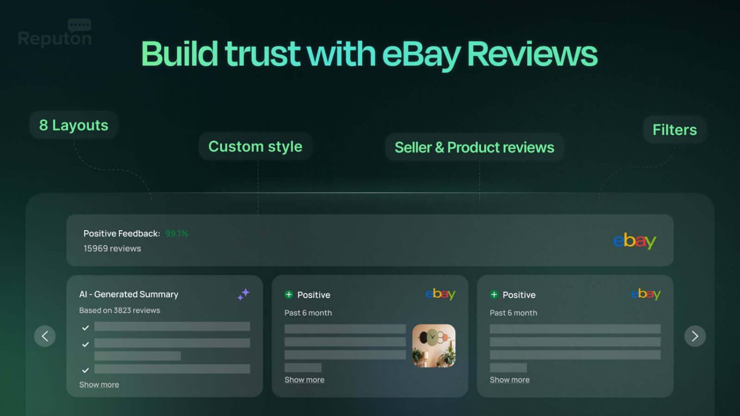 Importez des avis eBay avec des résumés basés sur l'IA pour renforcer la confiance, stimuler les ventes et renforcer la crédibilité des produits.