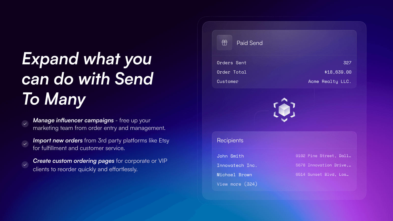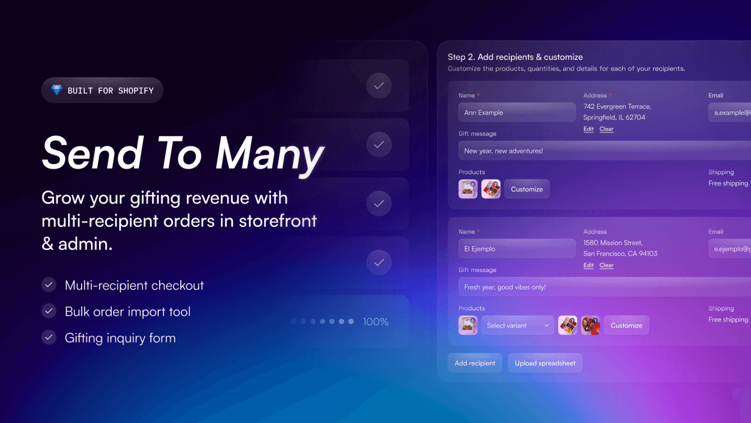Gestionnaire de commandes groupées pour Shopify, idéal pour les cadeaux d'entreprise, les influenceurs et les envois multi-destinataires.