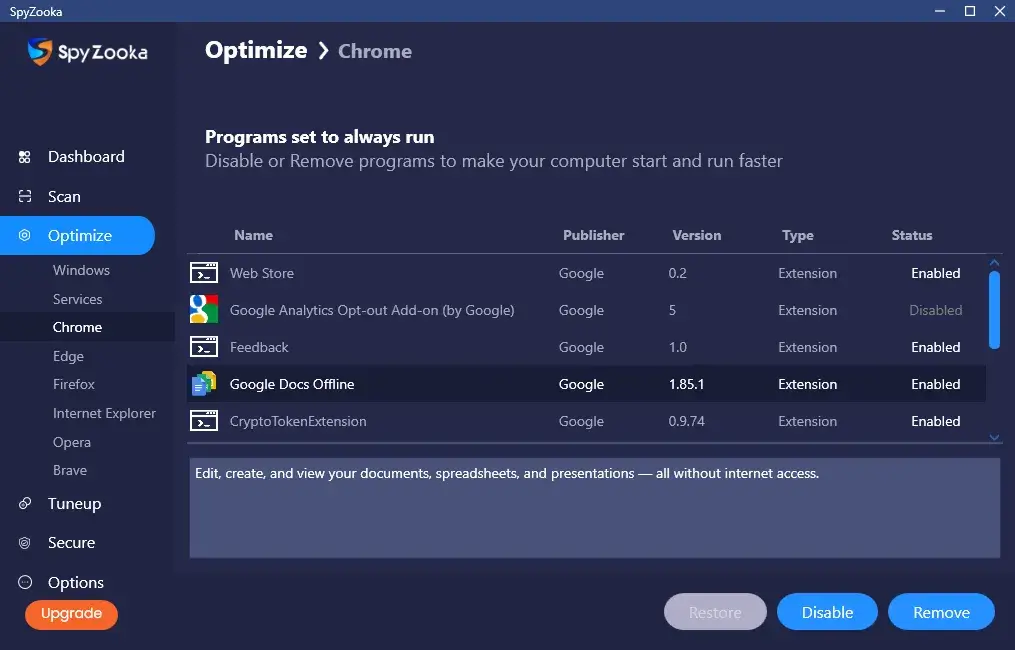 SpyZooka est conçu pour nettoyer, accélérer et protéger votre PC en un seul clic. Que vous soyez un débutant ou un utilisateur expérimenté, SpyZooka vous permet de supprimer facilement l'encombrement, d'améliorer les performances et de bloquer les espions