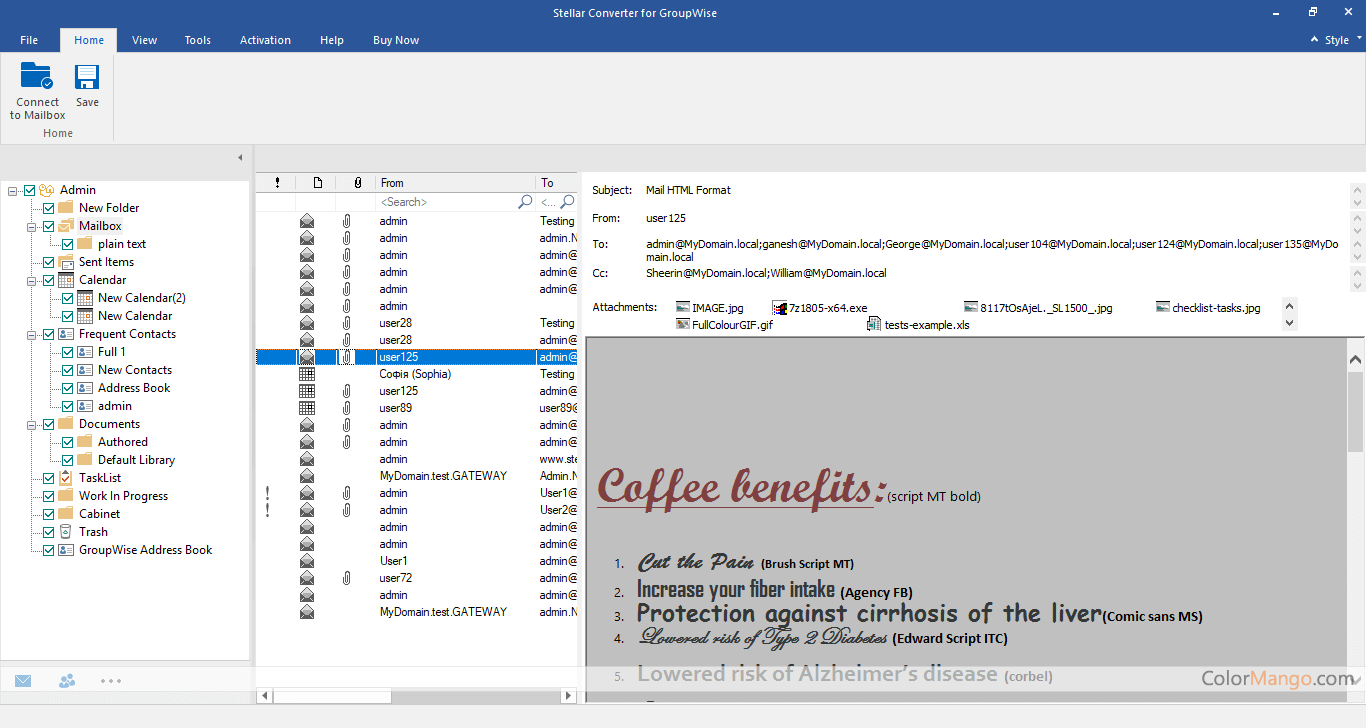 Stellar Converter for GroupWise Caractéristiques Convertissez tous les éléments de la boîte aux lettres GroupWise et prévisualisez les fichiers convertis. Convertissez des éléments de boîte aux lettres en mode en ligne, à distance, en cache et en mode archivage Enregistrez les données de boîte aux lettres converties au format PST, MSG, EML, RTF, PDF ou HTML. Vous pouvez exporter directement le fichier converti vers Office 365. Convertissez plusieurs boîtes aux lettres via un processus par lots GroupWise 2018, 2014, 2012, 8.0, 7.0, 6.5 et 6.0 sont pris en charge.