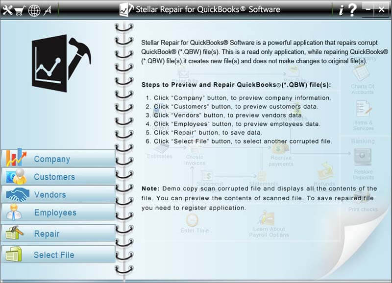 Caractéristiques de Stellar Repair for QuickBooks : + Restaure tous les articles de l'entreprise, des clients, des fournisseurs et des employés + Restaure les chèques de salaire, les transactions de paie, les détails du poste, etc. + Fournit un aperçu de toutes les données récupérables dans le fichier QBW corrompu + Pour récupérer des données QuickBooks à partir d'un fichier de sauvegarde QuickBooks (QBB) + Fonctionne avec QuickBooks Pro, Premier et Enterprise + Corrige les fichiers QuickBooks créés dans toutes les versions de QuickBooks de 2007 à 2019