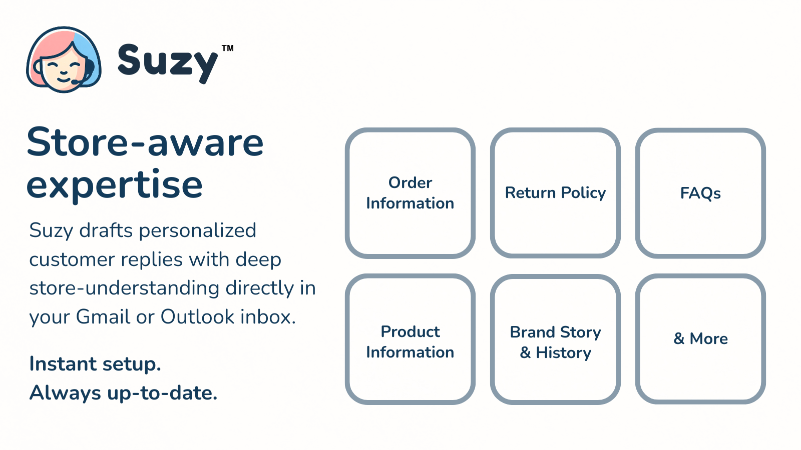 Suzy est un assistant d'intelligence artificielle qui écrit les réponses du support client en fonction de la boutique dans Gmail/Outlook, afin que vous puissiez appuyer sur Envoyer plus rapidement.