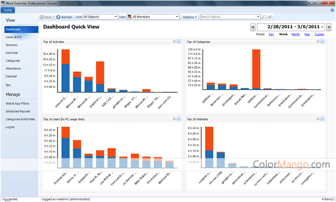 Work Examiner Features: ● Network activity tracking (website access and file download) ● Screenshot capture ● Record activities and store them in video files that can be played back. ● Network filtering ● Prevent data leakage ● Keyboard recording and instant message tracking ● Report